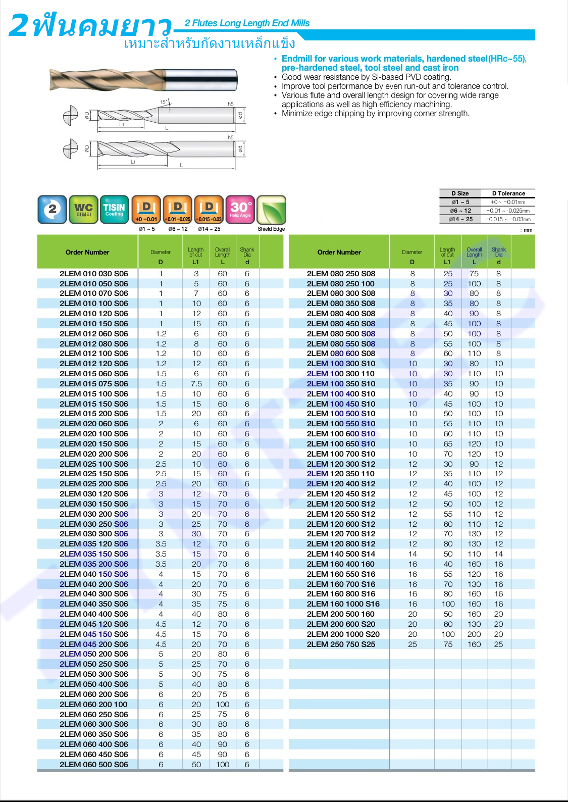 ดอกเอ็นมิล 2 ฟันคมกัดยาวพิเศษ ผลิตจากไมโครเกรนคาร์ไบด์ เคลือบPVD TiSiN Coating เหมาะสำหรับงานกัดเหล็กอัลลอย,เหล็กก่อนชุบ และ หลังชุบแข็ง
