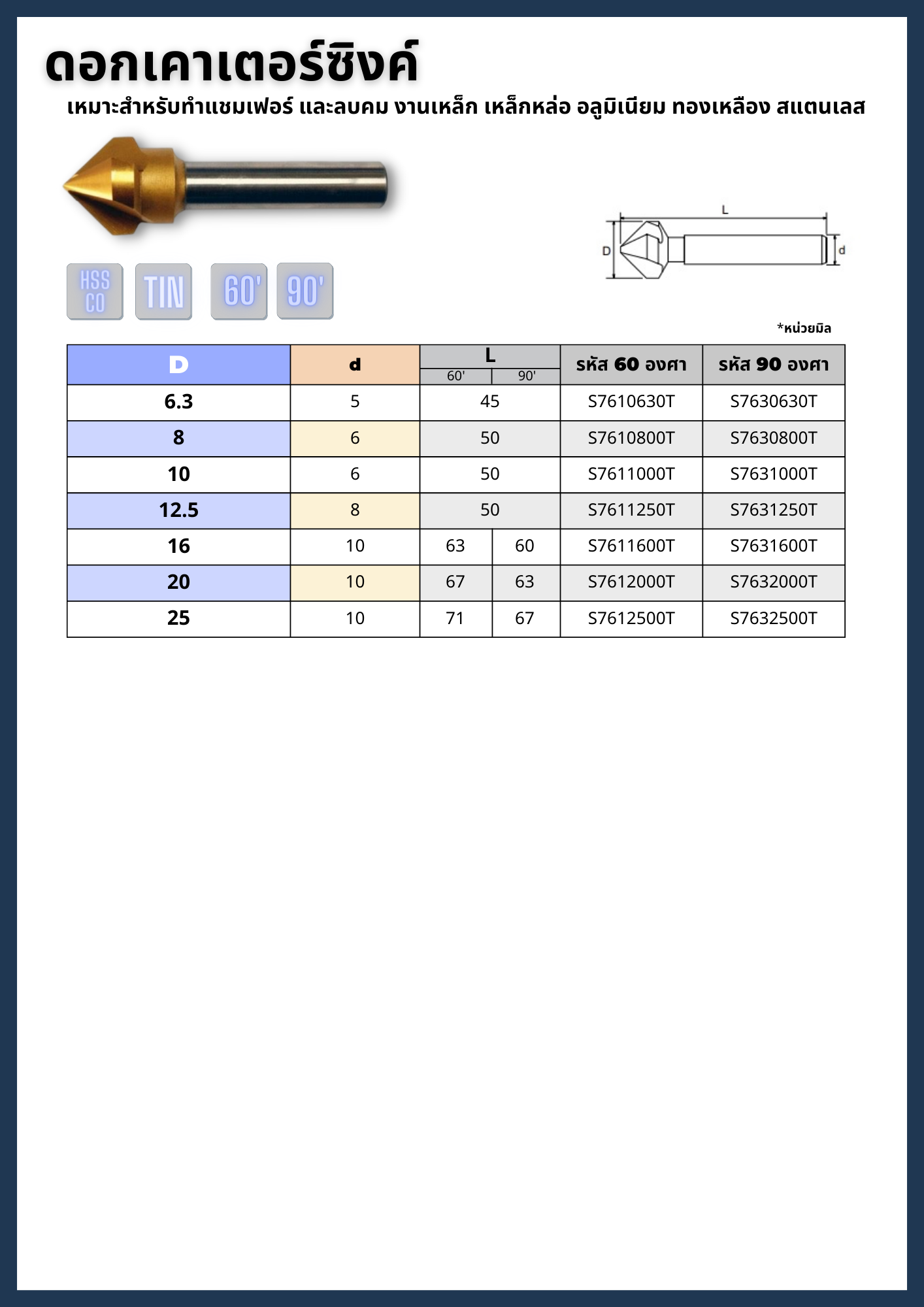 ดอกเคาเตอร์ซิ้ง สำหรับงานลบคม ทำแชมเฟอร์ ผลิตจากHSS-Co และชุบด้วยTiN (สีทอง) ทนทานมากขึ้น